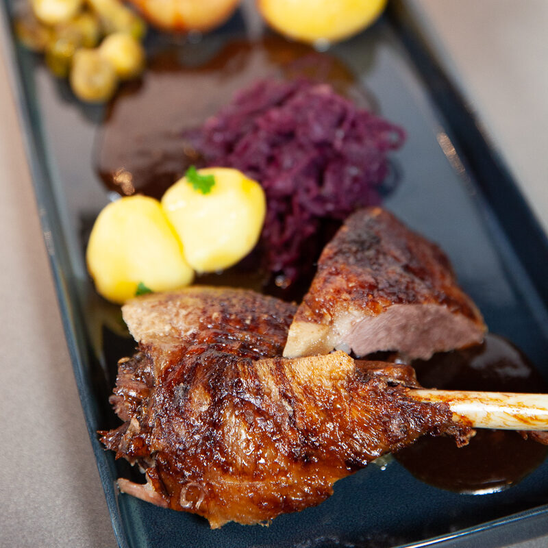Apfelrotkohl | handgeriebener Kartoffelkloß | Orangen-Jus