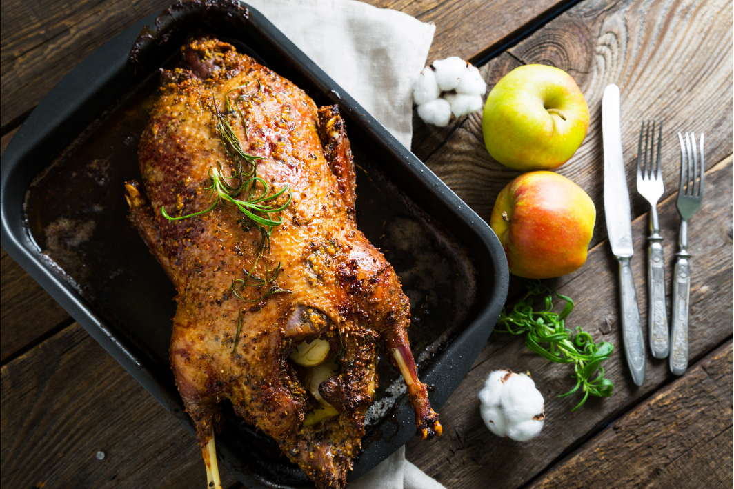 Four-country goose with apple red cabbage, Brussels sprouts with bacon, celery puree, cranberries, apple compote and hand-grated potato dumplings.